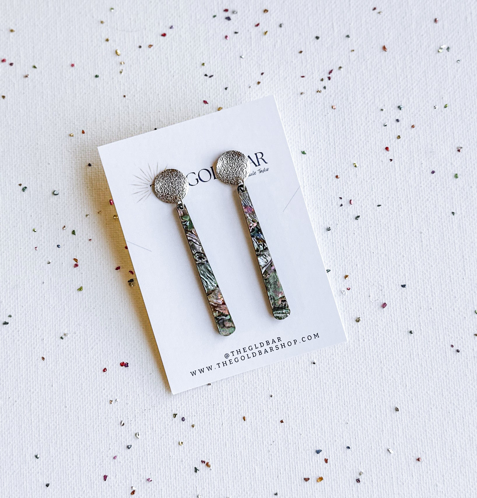 Silver hammered studs with a stunning abalone teardrop pendant. Super lightweight, picking up every color in the light!