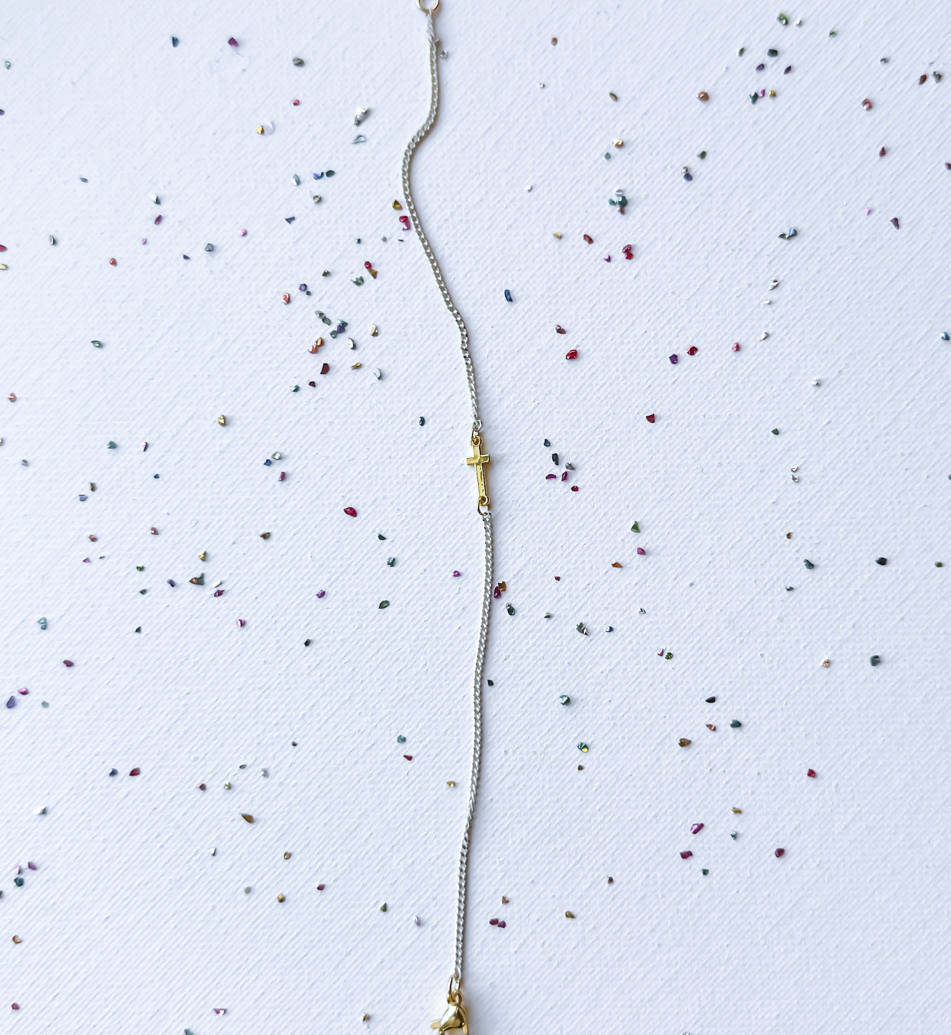 Cream enamel and gold chain with a dainty gold cross. 7”